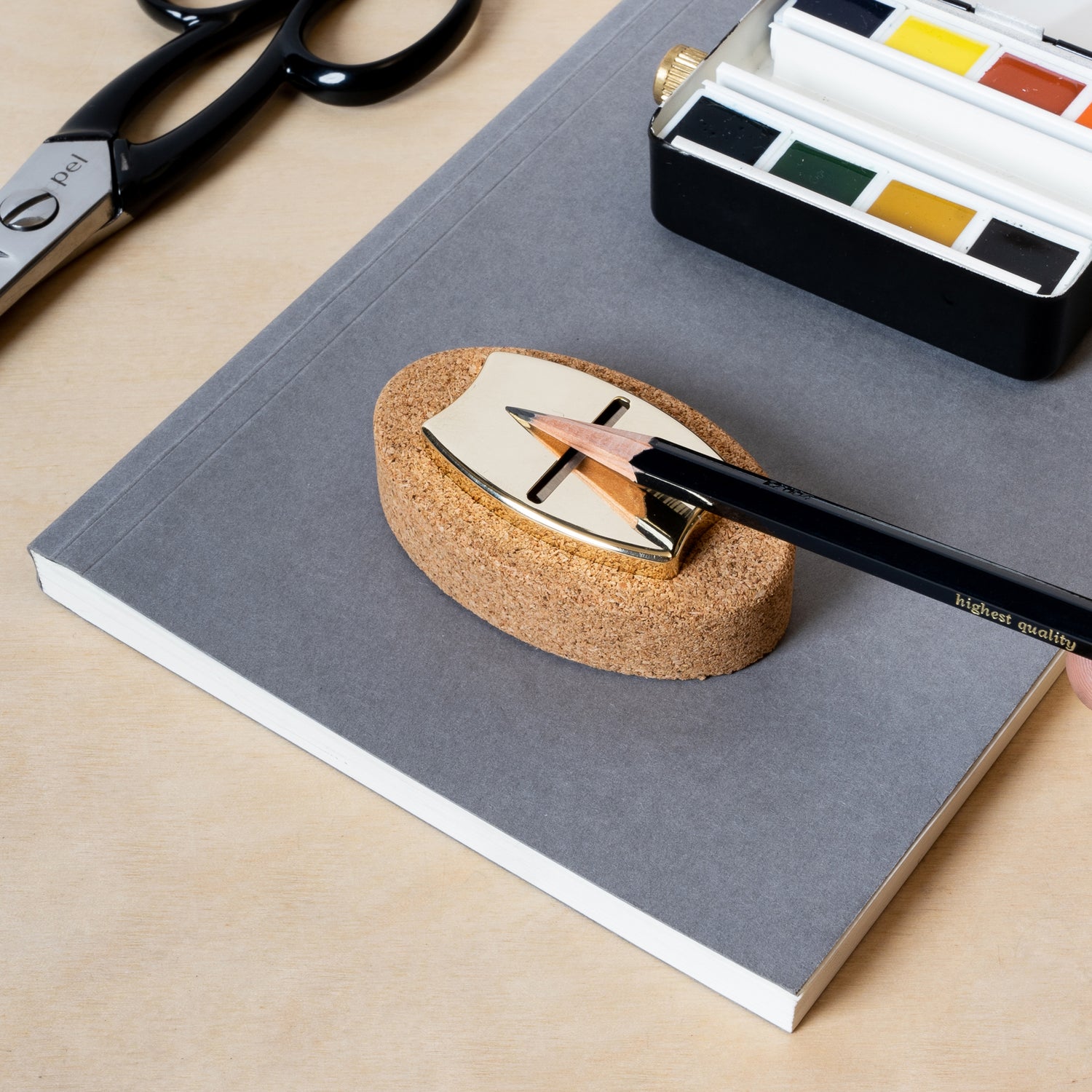 The base functions as a chamber for shavings as you sharpen and looks great on any desk. Both walnut and cork bases make the perfect companion to your Høvel.