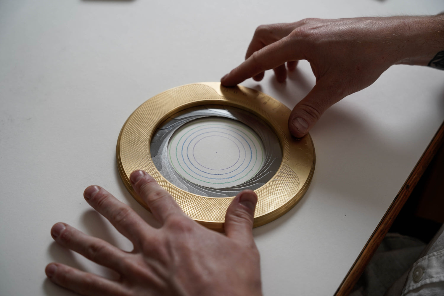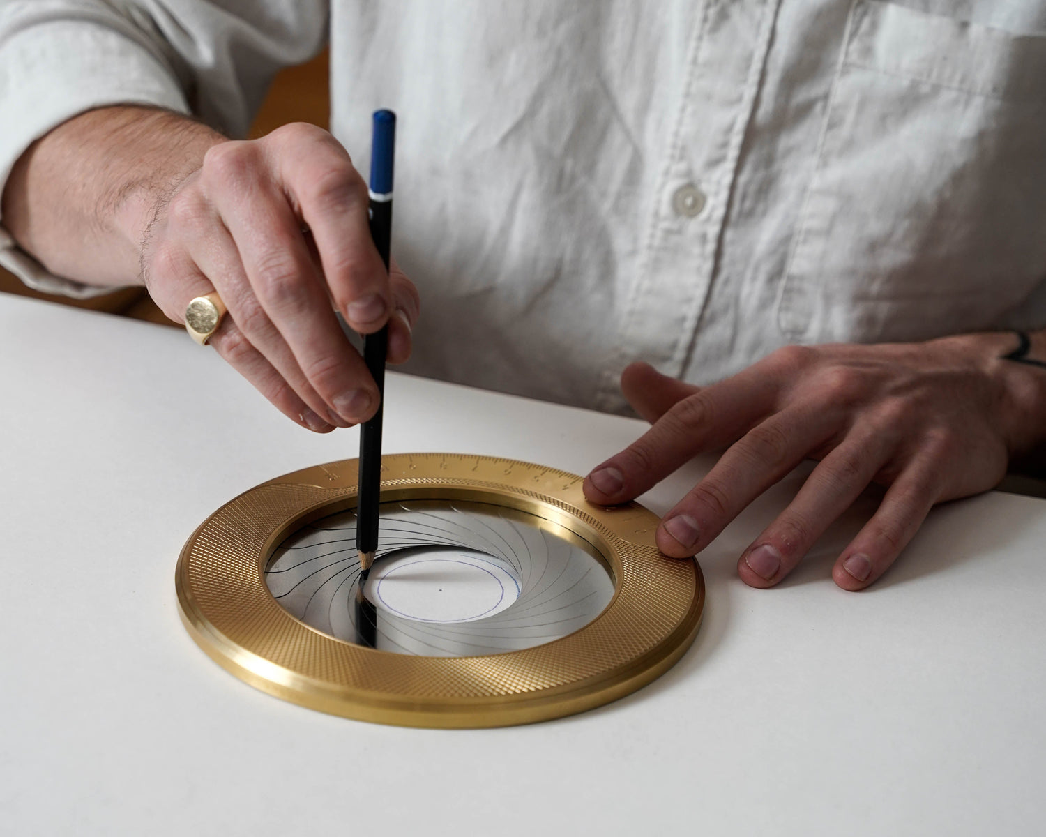 Iris LF gives you the freedom to draw circles effortlessly. Iris LF is the new and improved Iris scaled up to draw 120mm circles. Enjoy drawing single, concentric, or even shaded circles with its unique moving aperture. The walnut centring tool allows you to position your circle to a given point or can be used as a stand to display your Iris.
