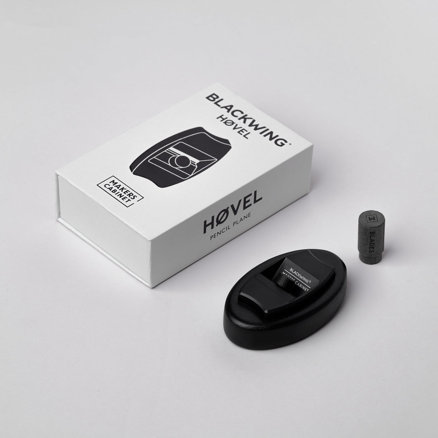 Our Blackwing Høvel comes with a black-dyed wood base to capture your shavings and one pack of 10 blades.